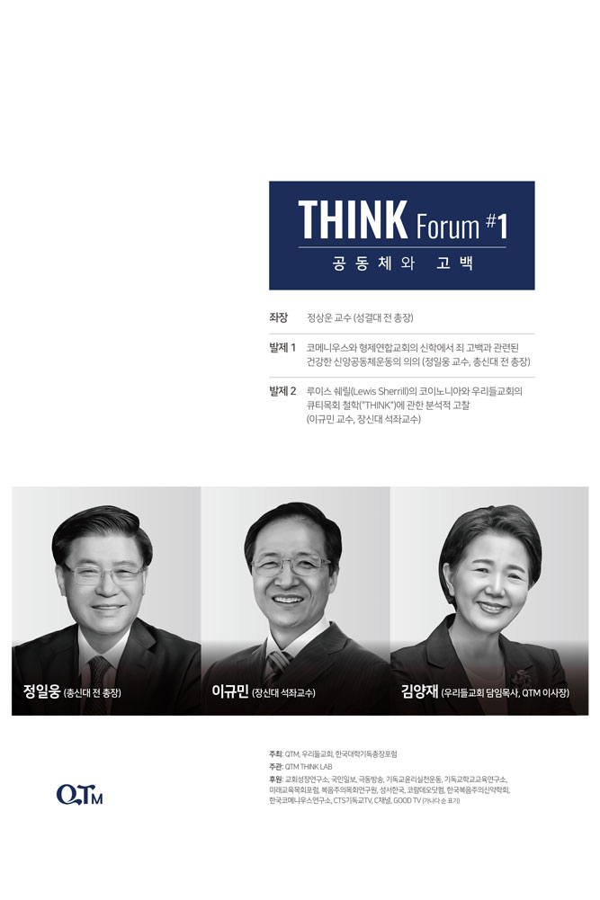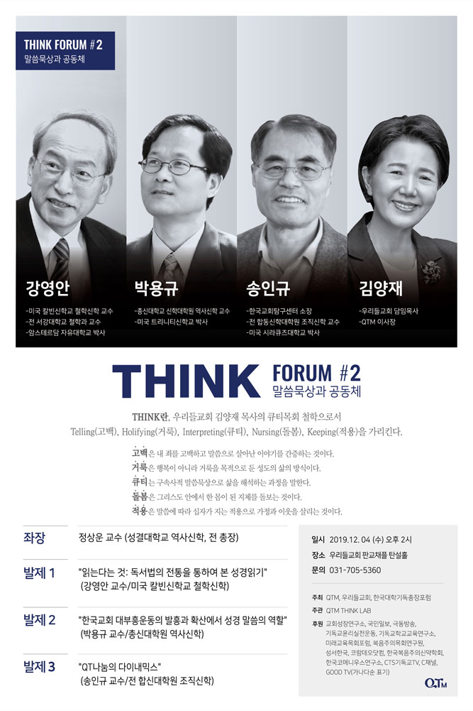 ‘THINK Forum’은 김양재 목사의 큐티목회 철학인 ‘THINK’를 토대로 큐티목회의 핵심 개념들과 주제들을 한국교회의 전문가들과 함께 학문적으로 조망해보고자 시작되었습니다.